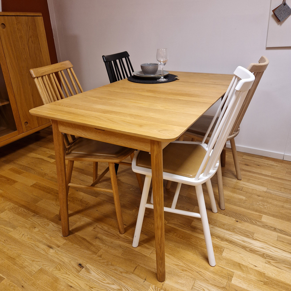 Träslag matbordet: Massiv oljad ek Mått matbordet: L 127(53) B 75 cm Träslag stolarna: 1st massiv oljad ek, 1st massiv vitoljad ek, 1st massiv björk, kulör svart, 1st massiv björk, vitlack. Tillverkare: HansK