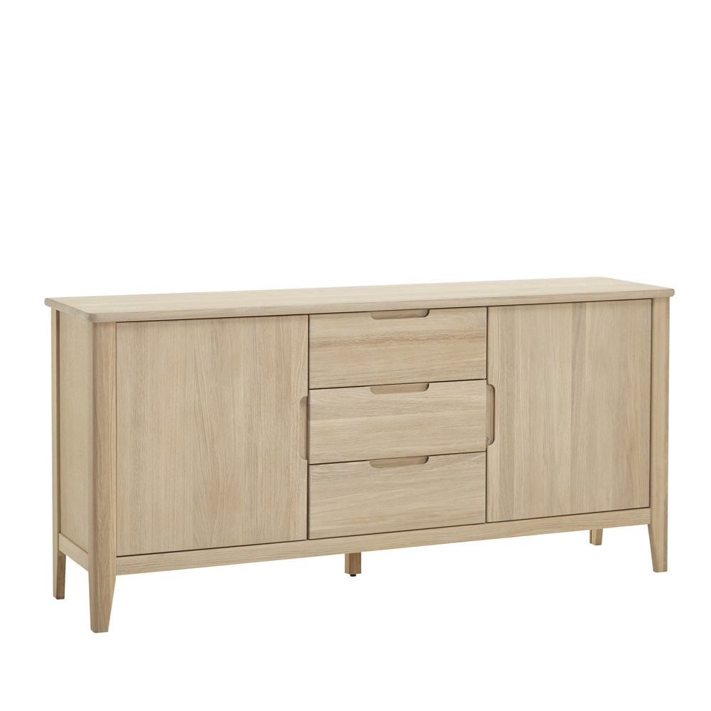 Funktionellt sideboard i stilren design med gott om förvaring. Tillverkat i massiv fingerskarvad europeisk ek. Luckor och lådor har en mjukstängande sk soft-close funktion. Skåpet ingår i vår omfångsrika Brooklyn-serie där samtliga delar är FSC®-certifierade.